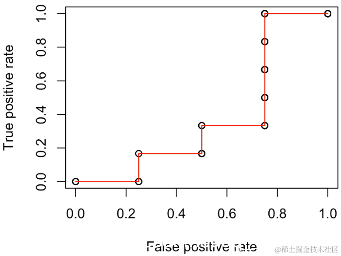 之前我们讨论了使用ROC曲线来描述分类器的优势,有人说它描述了“随机猜测类别的策略”,让我们回到ROC曲线来说明。考虑一个非常简单的数据集,其中包含10个观测值(不可线性分离)