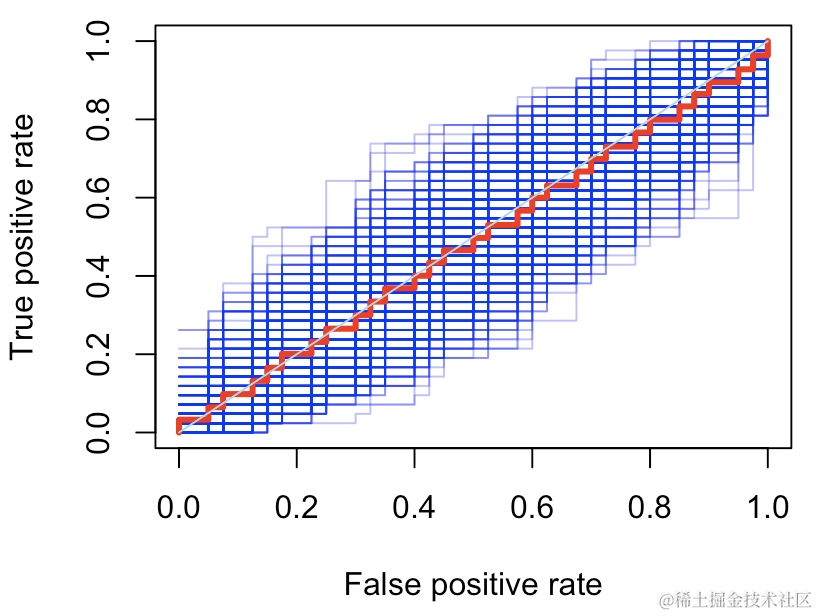 红线是所有随机分类器的平均值。它不是一条直线,我们观察到它在对角线周围的波动。