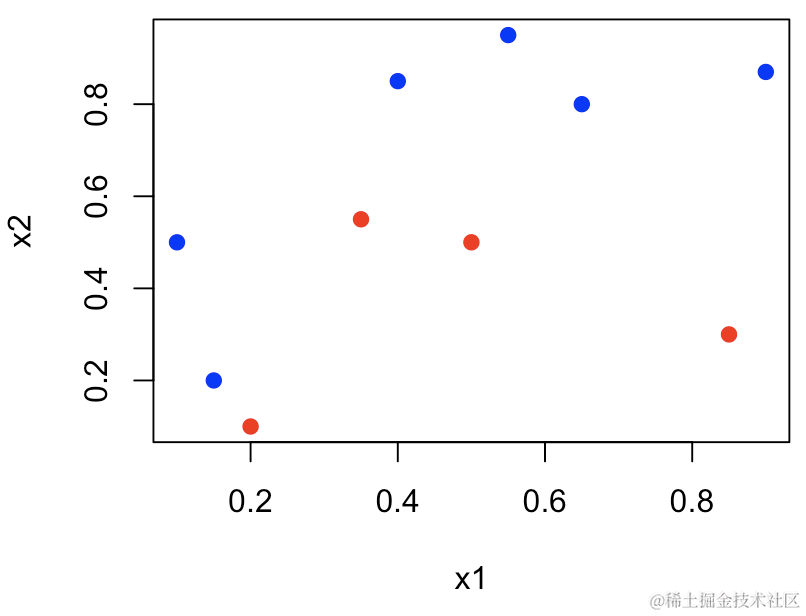 plot(x1,x2,col=c("red","blue")[1+y],pch=19)