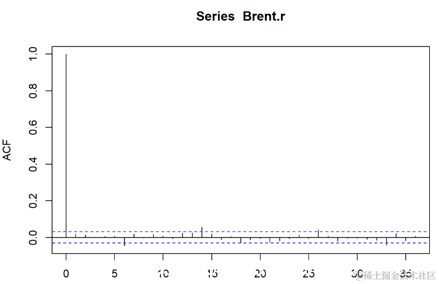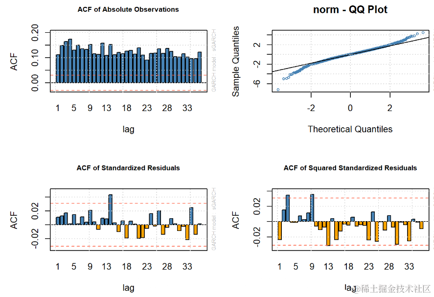 - 绝对观测值的ACF表明存在很大的波动性聚类。