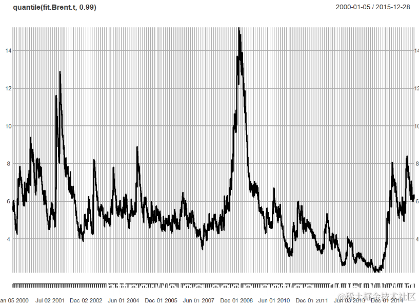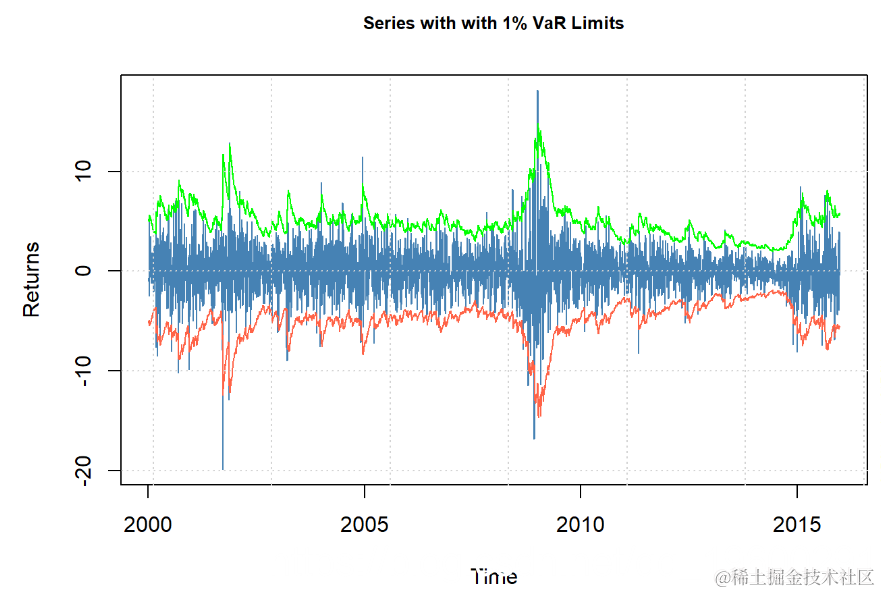 让我们看一下该模型中的条件分位数,也称为VaR,设置为99%。