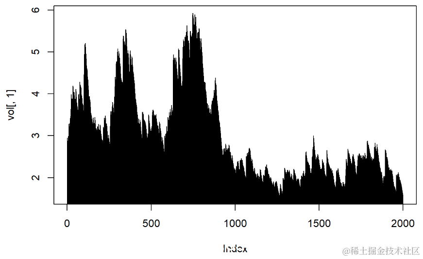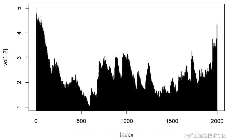 sig2[t+1] <- omega + alpha * e[t ^2 ## 生成新的sigma ^ 2。