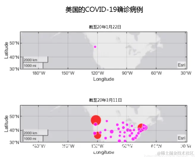 可以看到它始于华盛顿,并在加利福尼亚和纽约爆发了大规模疫情。