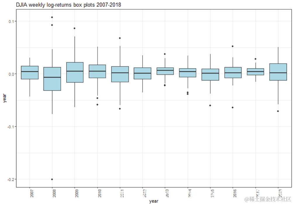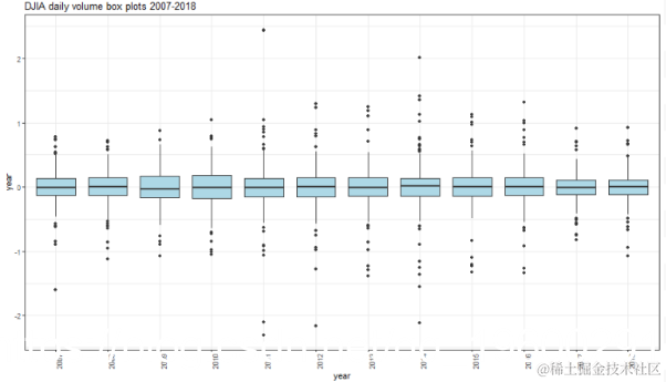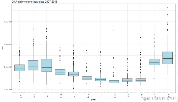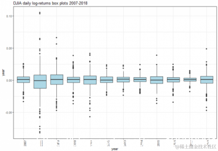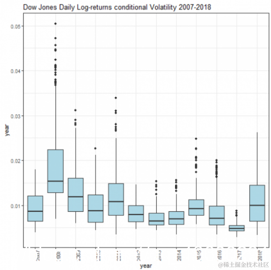 显示了按年列出的条件波动率箱图。