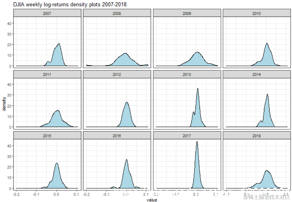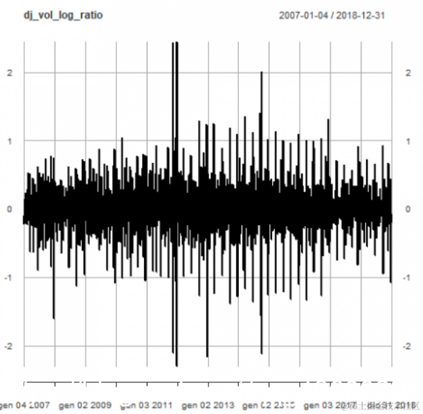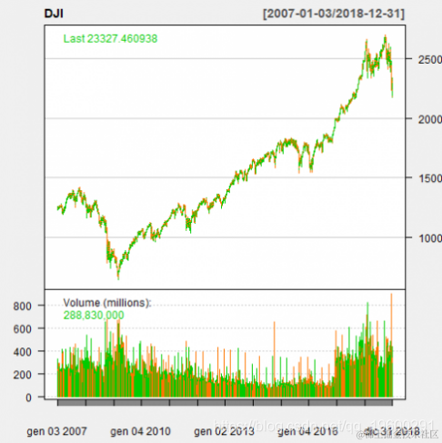 利用quantmod软件包中提供的getSymbols()函数,我们可以获得2007年至2018年底的工业平均指数。