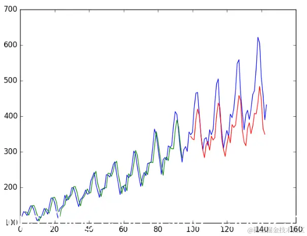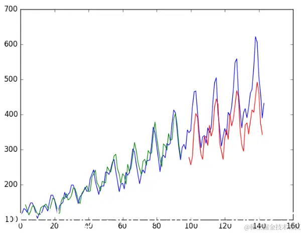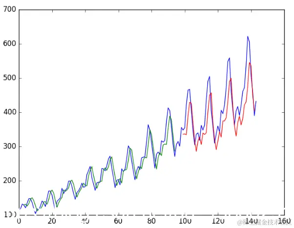 由于数据集的准备方式,我们必须移动预测,以使它们在x轴上与原始数据集对齐。准备好之后,将数据绘制成图表,以蓝色显示原始数据集,以绿色显示训练数据集的预测,以红色显示看不见的测试数据集的预测。