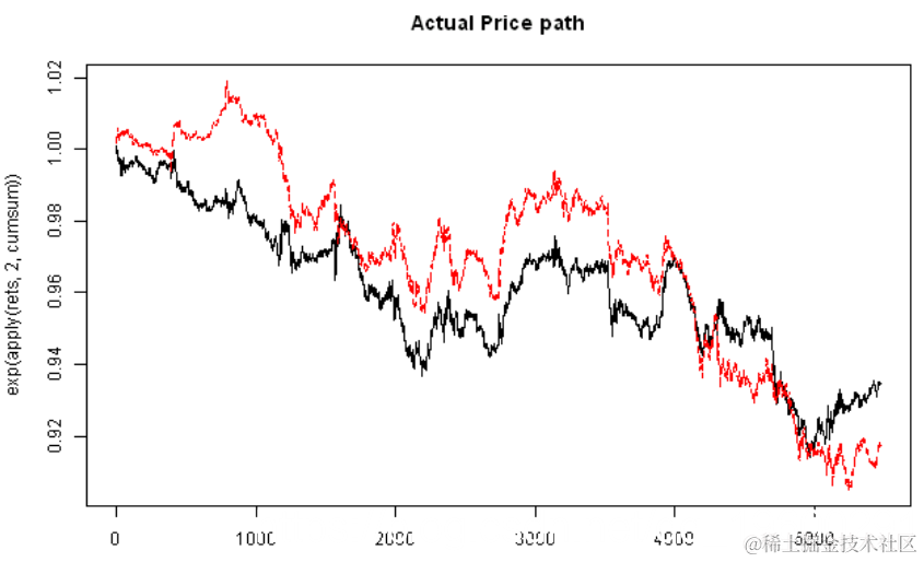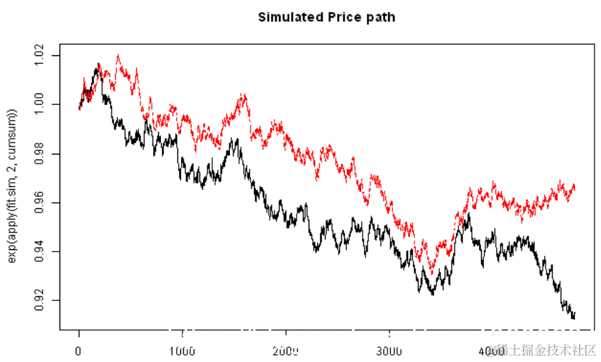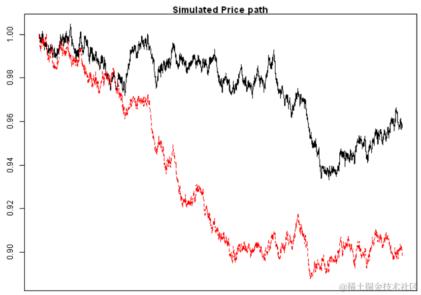 matplot(exp(apply(fit.sim,2,cumsum)), type='l', main='Simulated Price path')