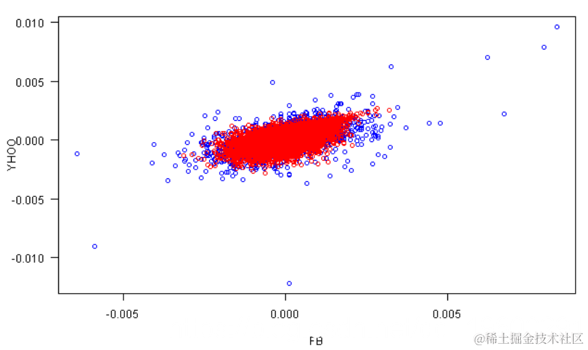 plot(rets[,1], rets[,2], xlab=labs[1], ylab=labs[2], col='blue', las=1)