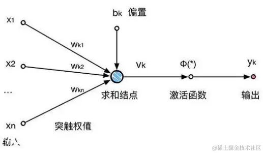 树突接收来自其他神经元的信号。单元体将所有输入信号求和以生成输出。当总和达到阈值时通过轴突输出。突触是神经元相互作用的一个点。它将电化学信号传输到另一个神经元。