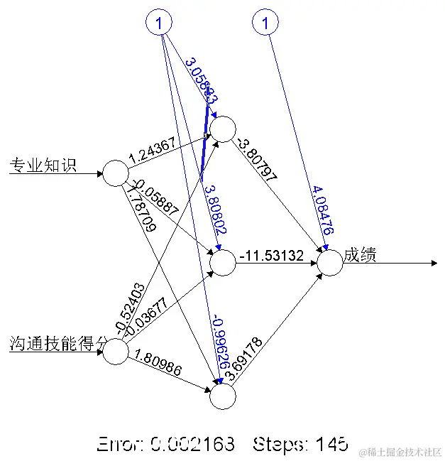 nn(成绩~专业知识+沟通技能得分, hidden=3,act.fct = "logistic",