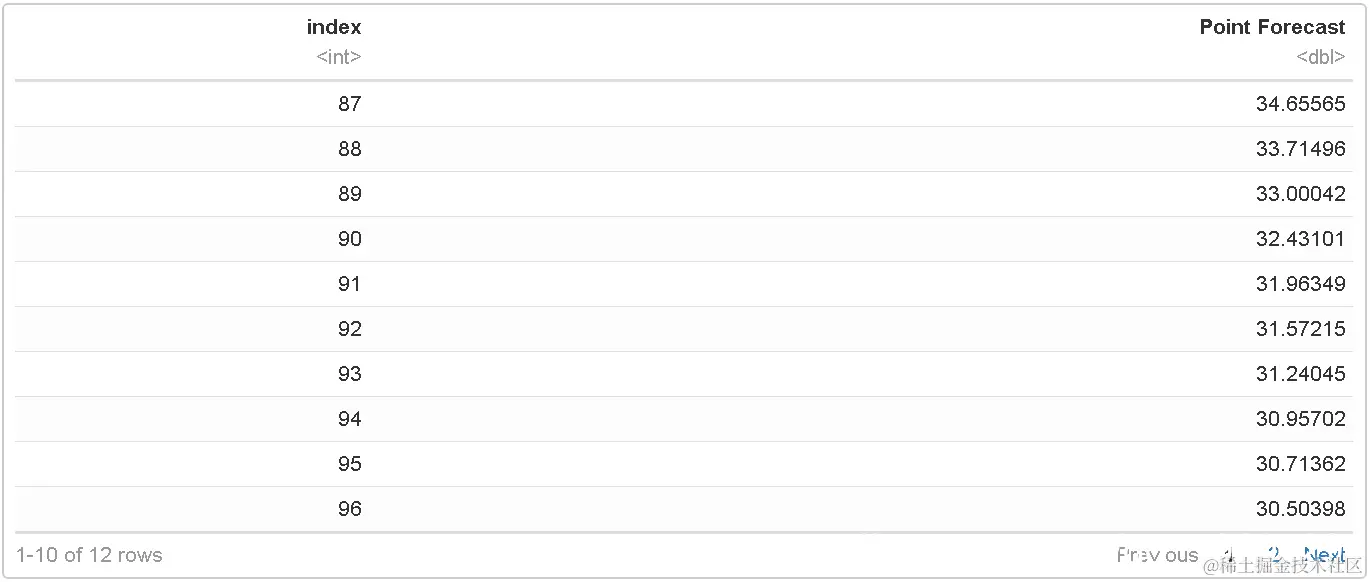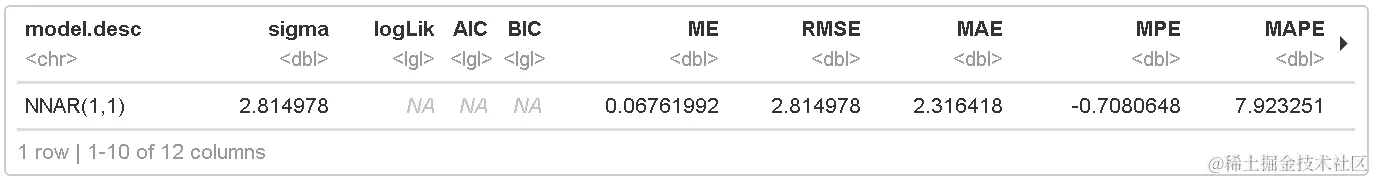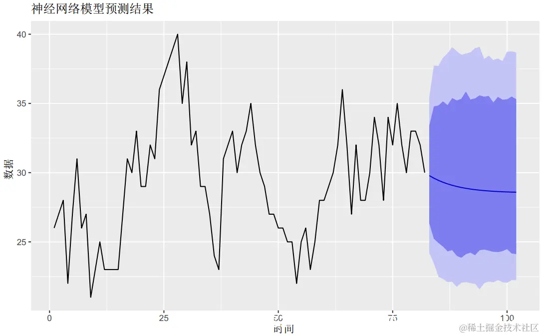 具有单个隐藏层和滞后输入的前馈神经网络,可以用于预测单变量时间序列。将神经网络模型拟合到以时间序列的滞后值作为输入的时间序列。因此它是一个非线性的模型,不可能得出预测区间。