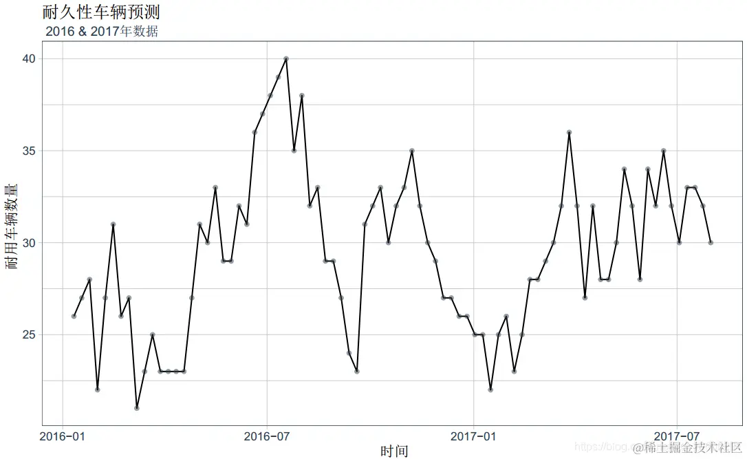 labs(title = "耐久性车辆预测", x = "时间", y = "耐用车辆数量",