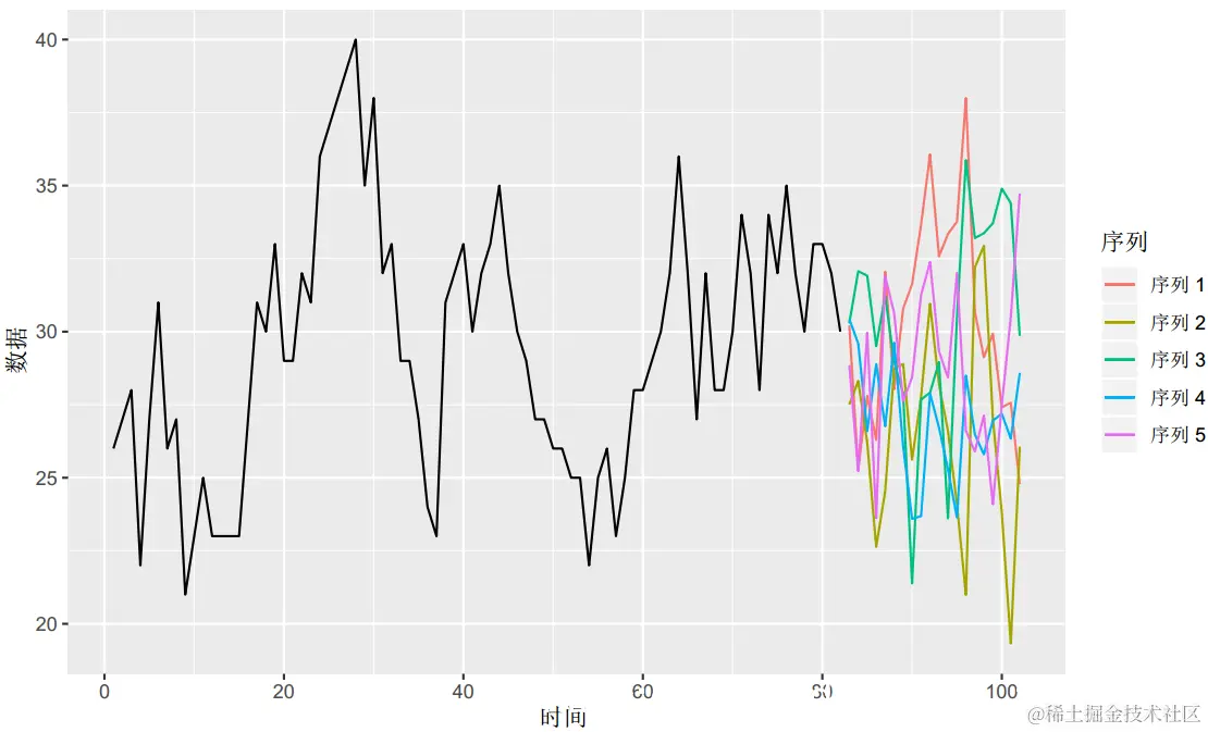 通过从正态分布或从历史值中重采样随机生成ϵt的值,我们可以迭代地模拟该模型的未来样本路径。