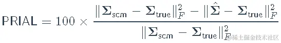 我们在训练阶段估计模型,然后将估计的协方差矩阵与测试阶段的样本协方差矩阵进行比较。估计误差将根据PRIAL(平均损失提高百分比)进行评估: