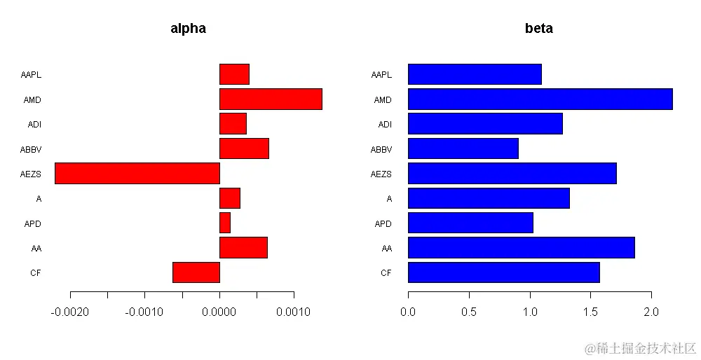 cbind(alpha = factor_model$alpha, beta = factor_model$beta)