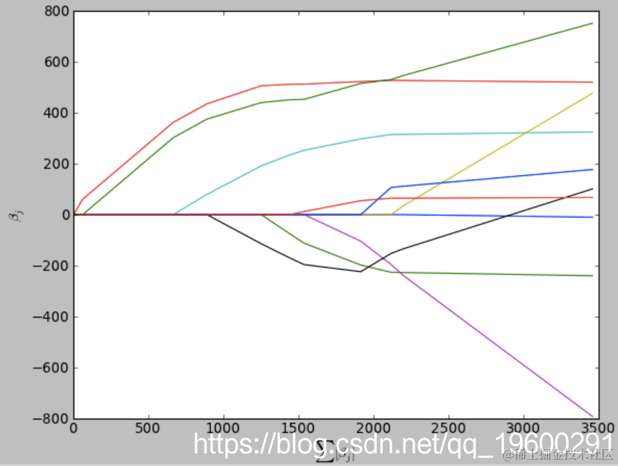 LARS解决方案没有给出矢量结果,而是由一条曲线组成,该曲线表示针对参数矢量L1范数的每个值的解决方案。该算法类似于逐步回归,但不是在每个步骤中都包含变量,而是在与每个变量的相关性与残差相关的方向上增加了估计的参数。