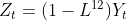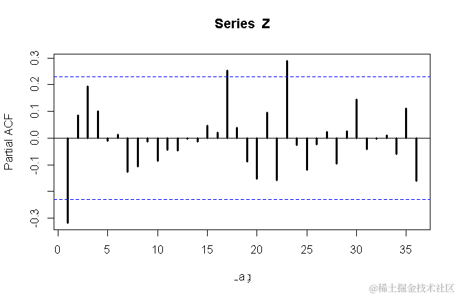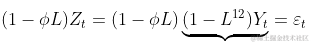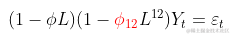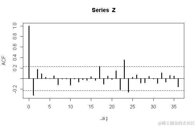 我们可以看到这里有一些季节性。第一个策略可能是假设存在季节性单位根,因此我们考虑 ,我们尝试找到ARMA模型。考虑时间序列的自相关函数,