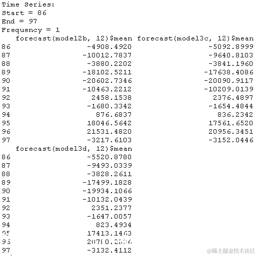 数字不同,但差异不大(请注意置信区间的大小)。这可以解释为什么在R中,当我们在自回归过程时 ,得到一个模型要估计的参数,即使其中不重要,我们通常也会保留它们来预测。