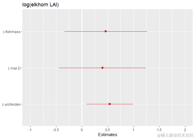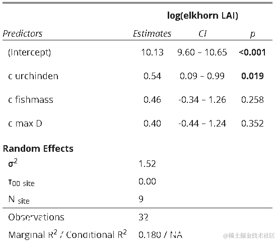 该模型以珊瑚覆盖层为因变量(elkhorn_LAI),草食动物种群和深度为固定效应(c。 urchinden,c.fishmass,c.maxD)和调查地点作为随机效应(地点)。