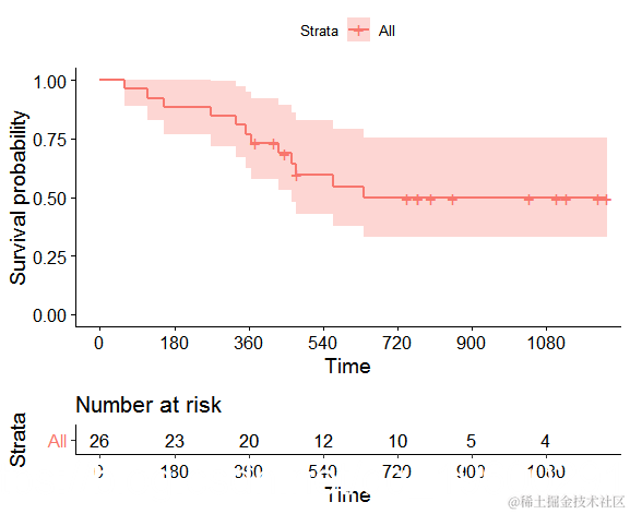 我们以数据 包中的dataset3survival为例。事件发生的时间就是死亡的时间。Kaplan-Meier图如下。