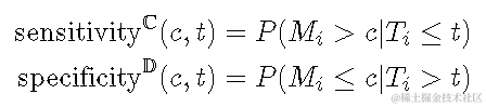 累积病例/动态ROC定义了在时间t 处的阈值c处的 灵敏度和特异性, 如下所示。