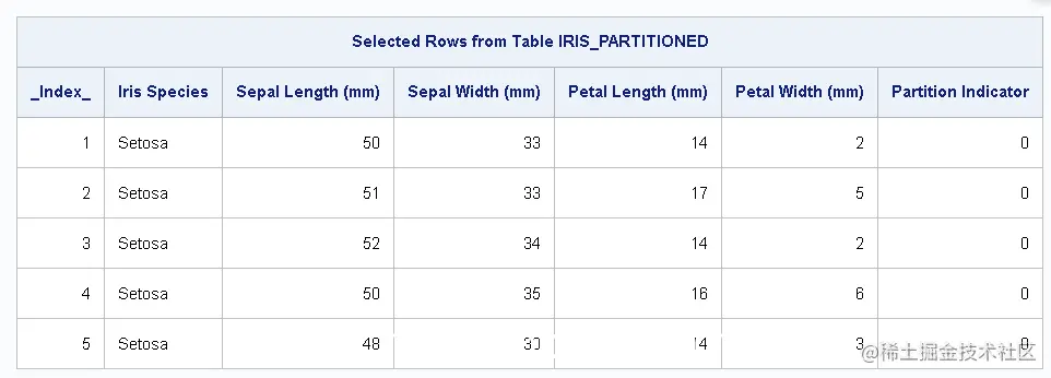 iris_partitioned表中的观测值,在分区指示符列(_partind_)中的值为0 。 - 确认验证数据表。验证数据是