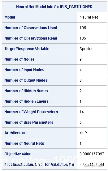 这些结果重申了关键的模型构建因素,例如模型类型;目标变量 神经网络模型输入,隐藏和输出节点的摘要;权重和偏差参数;最终目标值;以及评分验证数据集的误分类误差。
