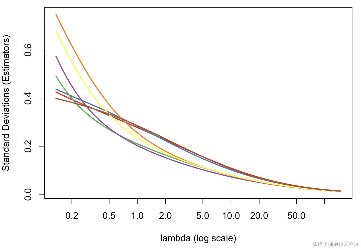 for(i in 2:7) lines(v_lambda,est_ridge[i,],col=colrs[i])