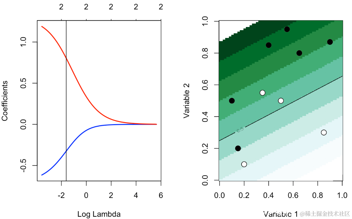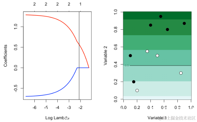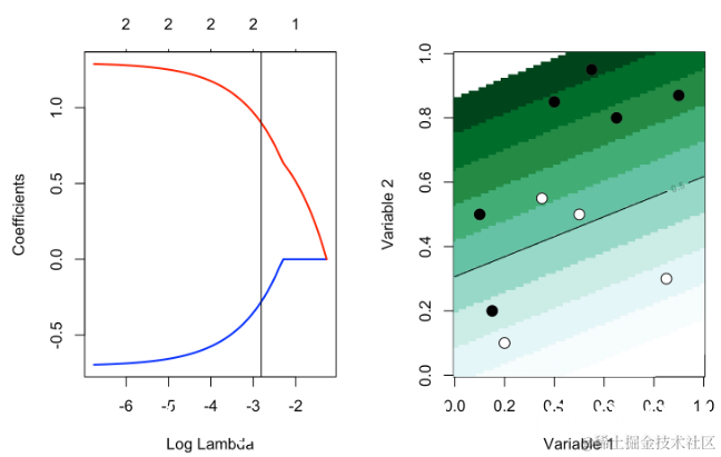 reg = glmnet(cbind(df0$x1,df0$x2), df0$y==1, alpha=1,lambda=lambda)