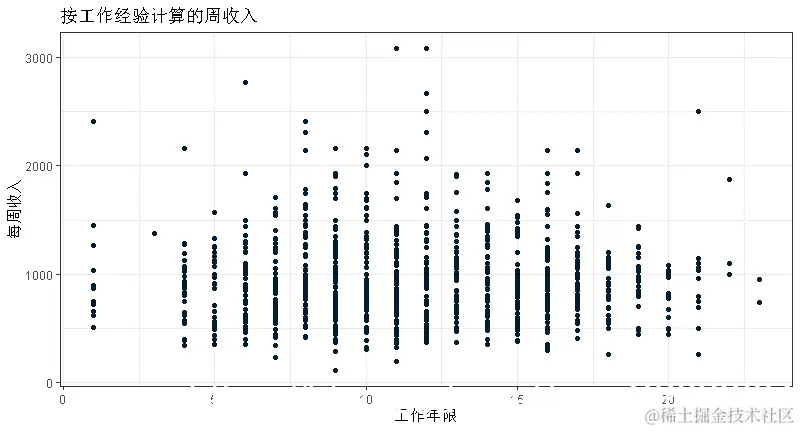 对于我们在数据中看到的工资差异,一个可能的解释是,更聪明的人赚更多的钱。下图显示了周工资和智商得分之间的散点图。