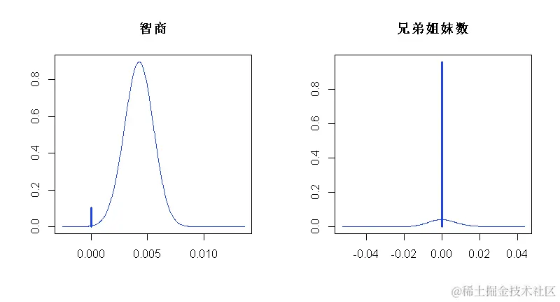 回想一下,给定σ2的α和β的后验分布是正态的,但略微遵循一个具有n−p−1自由度的t分布。在这种情况下,p=1,因为智商是我们模型中唯一的对数工资预测因子。因此,α和β的后验概率都遵循933自由度的t分布,因为df非常大,这些分布实际上是近似正态的。