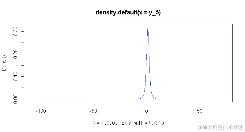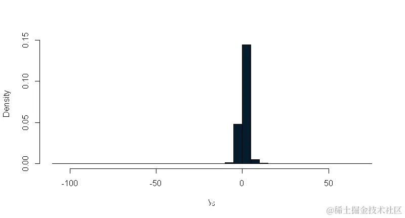 为了得到y5的预测分布,我们可以先从σ2的后验点模拟,然后再从μ模拟y5。我们对y5年的预测结果将来自一项新的观测结果的后验预测分布。下面的示例从y5的后验预测分布中提取100,000次。