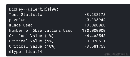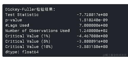 - Dickey-Fuller检验:这是检验平稳性的统计检验之一。这里的零假设是TS是非平稳的。检验结果包括检验统计量和不同置信水平的一些临界值。如果“检验统计量”小于“临界值”,我们可以拒绝零假设并说序列是平稳的。