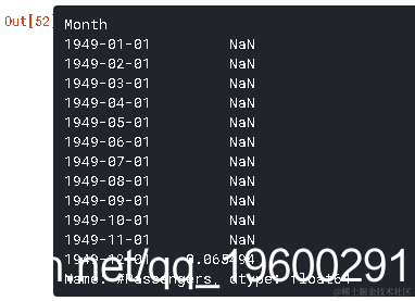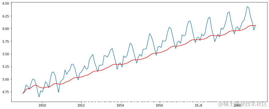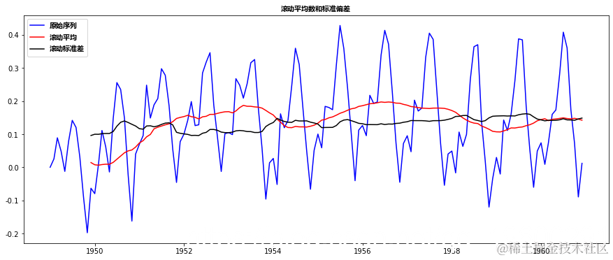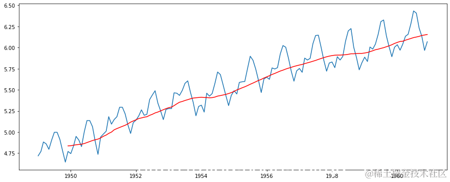 红线表示滚动平均值。我们从原来的数列中减去这个。注意,因为我们取最后12个值的平均值,所以滚动平均值没有定义前11个值。这可以观察到: