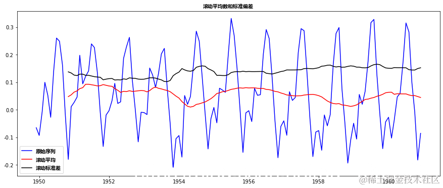 plt.title('滚动平均数和标准偏差',fontproperties=myfont)
