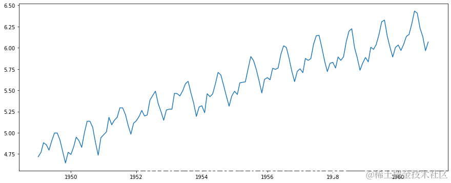 减少趋势的第一个技巧之一可以转换。例如,在这种情况下,我们可以清楚地看到存在显着的增长趋势。因此,我们可以应用转换,以惩罚更高的值,而不是较小的值。这些可以取对数,平方根,立方根等。在此处取对数转换简便简单: