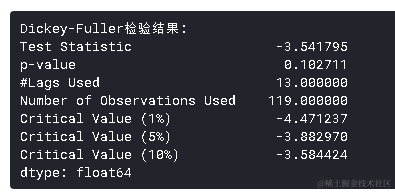 虽然标准差的变化很小,但平均值明显随时间增加,这不是一个平稳序列。而且,检验统计量远大于临界值。请注意,应该比较有符号的值,而不是绝对值。