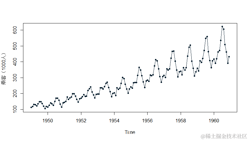 plot(tsdata, ylab="乘客(1000人)", type="o")