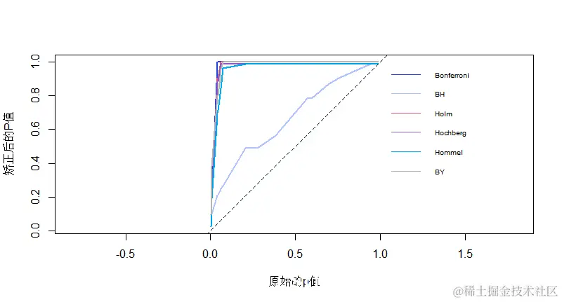 调整后的p值与原始p值在0到0.1之间的一系列5个p值的绘图。请注意,Holm和Hochberg的值与Hommel相同,因此被Hommel隐藏。虚线表示一对一的线。