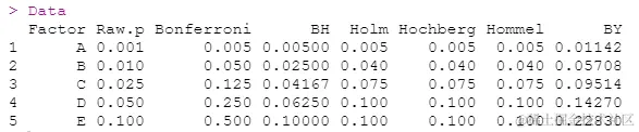 请注意,这些方法只需要调整p值和要比较的p值的数量。这与Tukey或Dunnett等方法不同,Tukey和Dunnett也需要基础数据的变异性。Tukey和Dunnett被认为是多重比较谬误(Familywise error rate)方法。