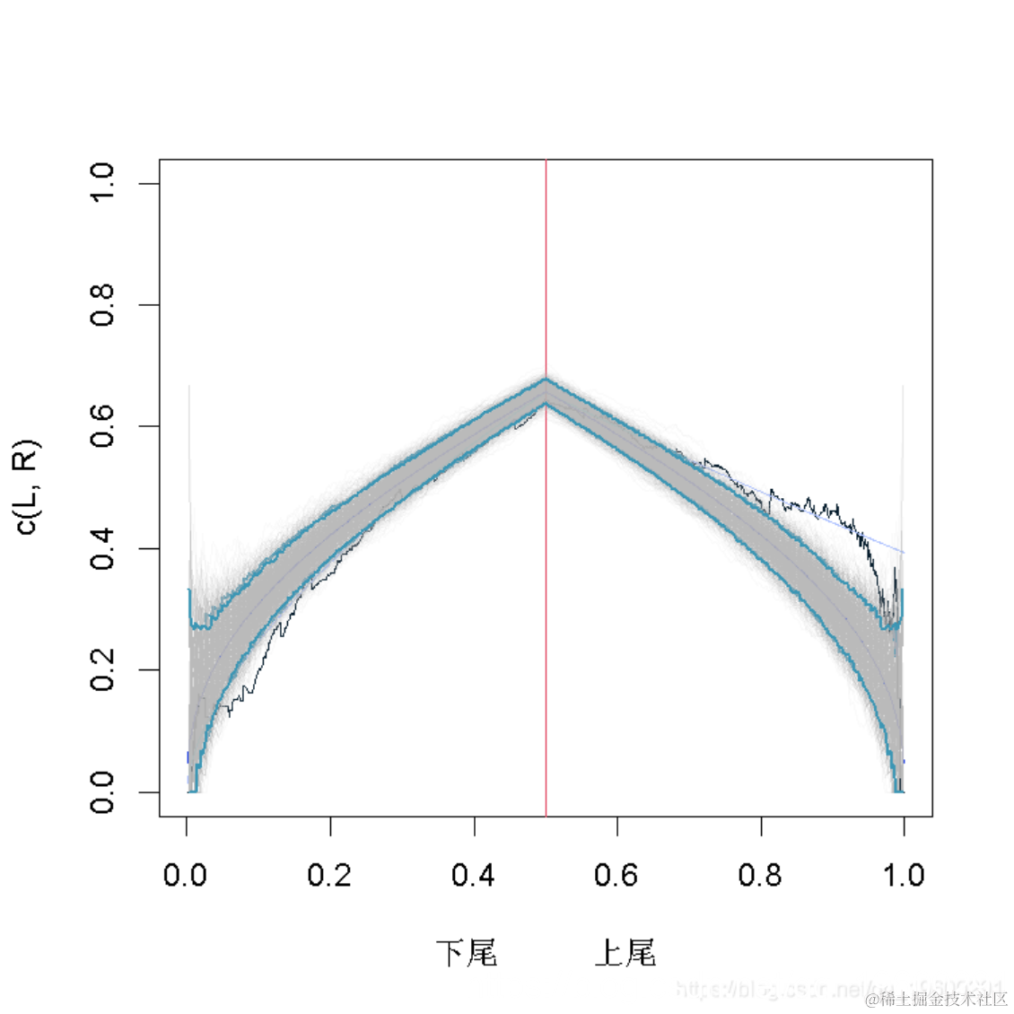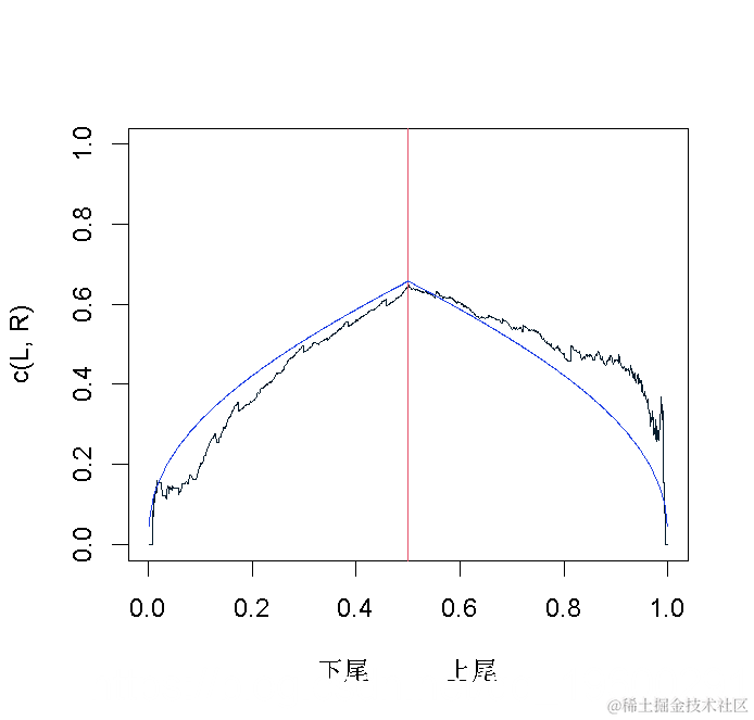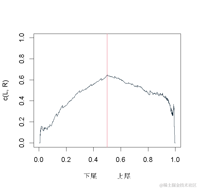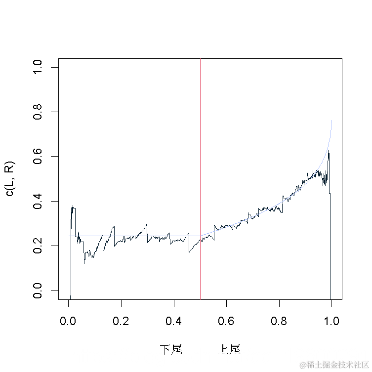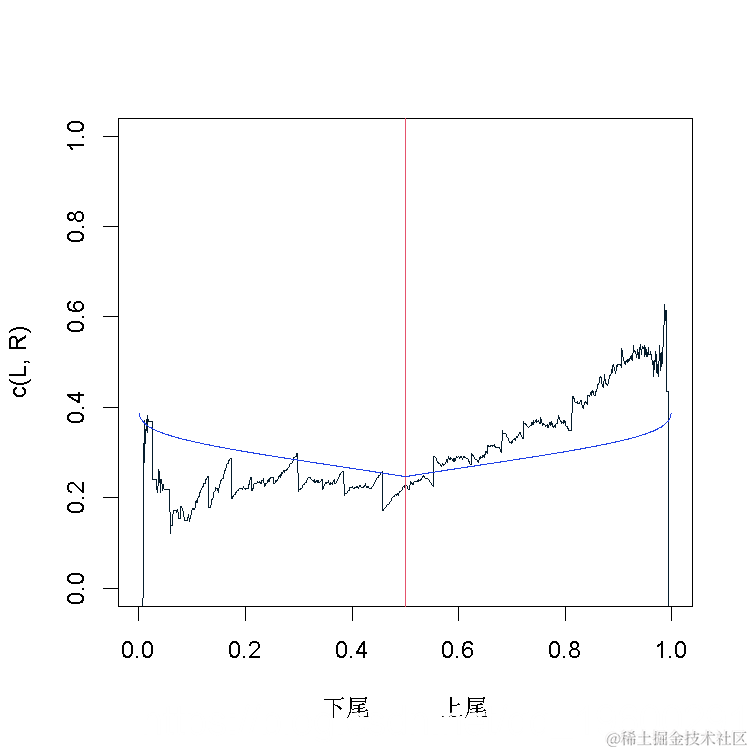 整合得到Pickands相依函数的估计值。上图中可以直观地看到上尾的相依指数。