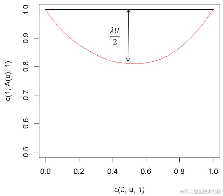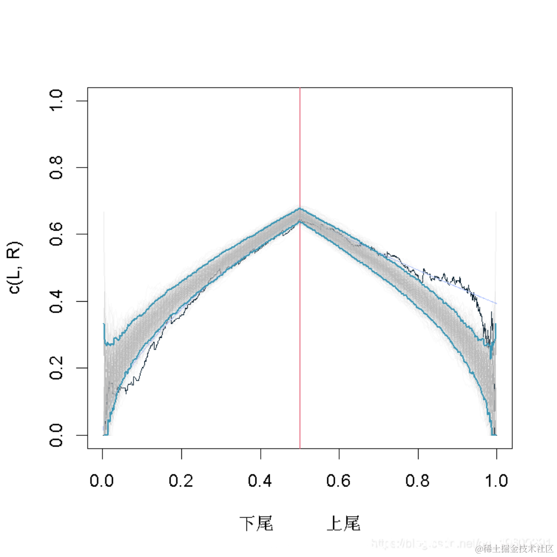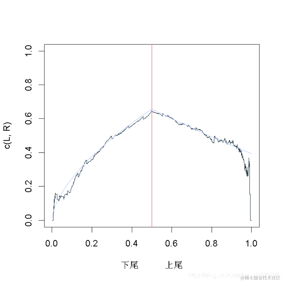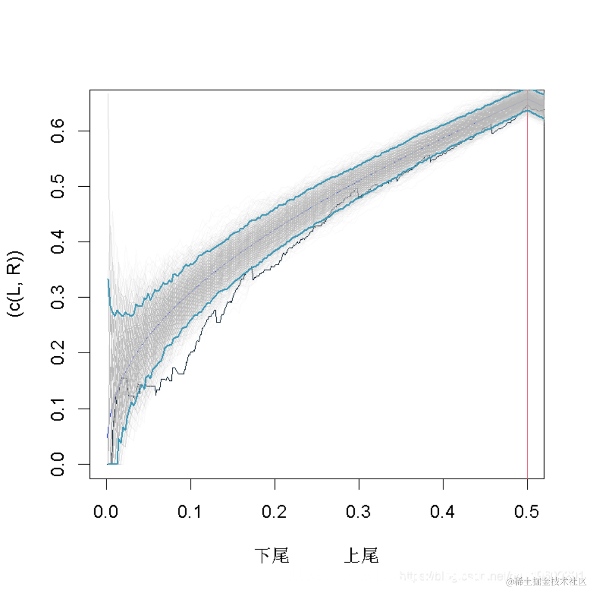 整合得到Pickands相依函数的估计值。上图中可以直观地看到上尾的相依指数。