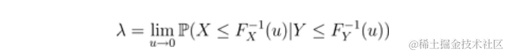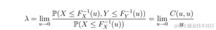 Joe(1990)提出了一个(强)尾部相依性指数。例如,对于下尾,可以考虑
