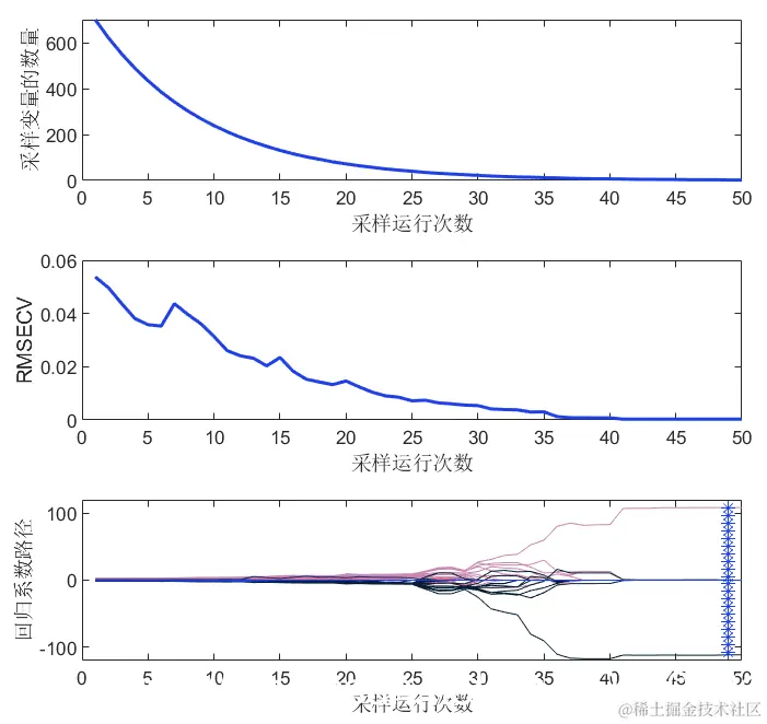 注:在这幅图中,顶部和中间的面板显示了选择变量的数量和RMSECV如何随着迭代而变化。底部面板描述了每个变量的回归系数(每条线对应一个变量)如何随着迭代而变化。星形垂直线表示具有最低RMSECV的最佳模型。