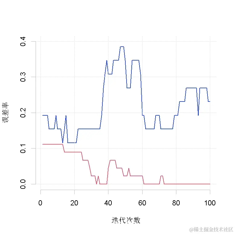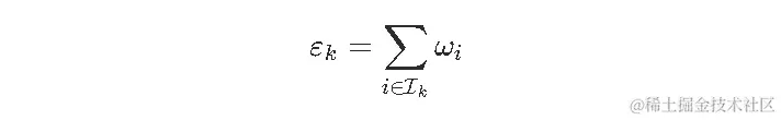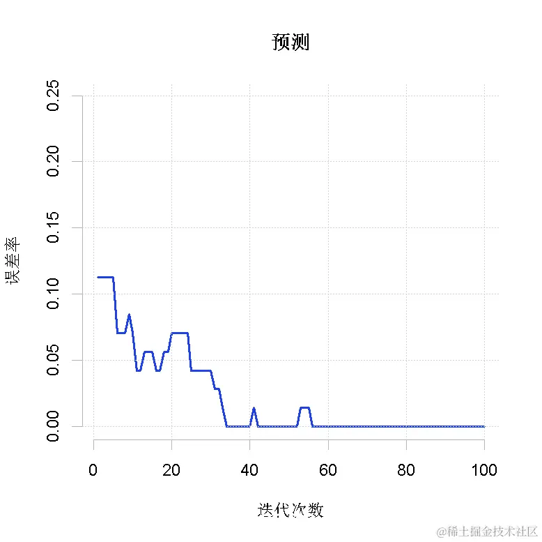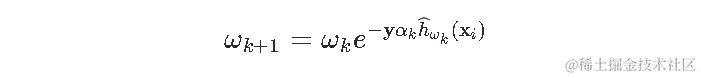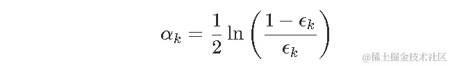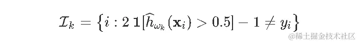 我们从ω0=1n开始,然后在每一步拟合一个模型(分类树),权重为ωk(我们没有讨论树的算法中的权重,但实际上在公式中是很直接的)。让hωk表示该模型(即每个叶子里的概率)。然后考虑分类器,它返回一个在{-1,+1}的值。然后设