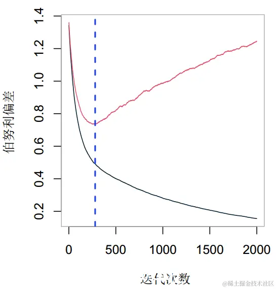 首先,我们拟合一个模型,通过一些协变量 x来解释 y。然后考虑残差 ε,并以相同的协变量 x来解释它们。如果你尝试用线性回归,你会在第1步结束时完成,因为残差 ε与协变量 x是正交的:我们没有办法从它们那里学习。在这里它是有效的,因为我们考虑的是简单的非线性模型。而实际上,可以使用的东西是添加一个收缩参数。不要考虑 ε=y-m(x),而是 ε=y-γm(x) 。弱学习的概念在这里是极其重要的。我们收缩得越多,花的时间就越长。不断从错误中学习是件好事。但从启发式的角度来看,当我们开始过度拟合时,我们应该停止。而这可以通过对初始数据集进行分割训练验证或使用交叉验证来观察。