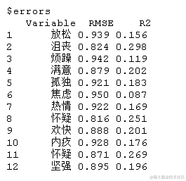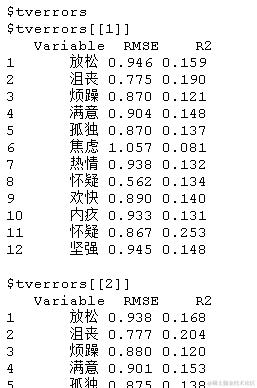 参数errorCon = c("R2", "RMSE")指定解释方差的比例(R^2)和均方根误差(RMSE)作为预测误差。最后一个参数Method指定了如何计算时间变化的预测误差。选项Method = "closestModel "使用最接近的局部模型对一个时间点进行预测。这里选择的选项tvMethod = "weighted",提供了所有局部模型预测的加权平均值,使用以当前时间点的位置为中心的加权函数进行加权。通常情况下,这两种方法得到的结果非常相似。
