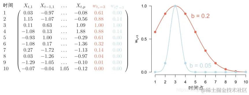 这里我们只说明在t=3时对局部模型的估计。我们在左边的面板上看到这个时间序列的10个时间点。红色的一列w_t_e=3表示我们在t=3时估计局部模型可能使用的一组权重:接近t=3的时间点的数据得到最高的权重,而更远的时间点得到越来越小的权重。定义这些权重的函数显示在右图中。左图中的蓝色柱子和右边相应的蓝色函数表示另一种可能的加权。使用这种加权,我们结合了更少的时间上接近的观测值。这使我们能够在参数中检测到更多的 "时间可变性",因为我们对更少的时间点进行了平滑处理。然而,另一方面,我们使用的数据较少,这使得我们的估计值不太可靠。因此,选择一个加权函数,在对 "时变性 "的敏感性和稳定的估计之间取得良好的平衡是很重要的。在这里介绍的方法中,我们使用了一个高斯加权函数(也称为核),它是由其标准差(或带宽)定义的。我们将在下面讨论如何选择一个好的带宽参数。