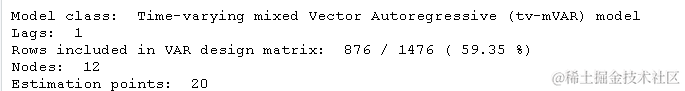 其中提供了模型的摘要,也显示了VAR设计矩阵中的行数(876)与数据集中的时间点数量(1476)。前者的数量较少,因为只有在给定的时间点也有滞后1年的时间点时,才能估计VAR(1)模型。