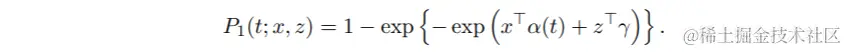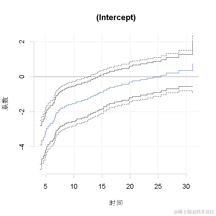 我们指定事件时间并删减变量为cause == 0。回归模型只包含一个截距项(+1)。cause变量给出了与不同事件相关的原因。cause= 1指定我们考虑类型1的事件。计算/基于估计值的时间可以由参数times = times1给出。